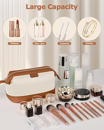 Wedama Makeup Bag, Large Capacity Travel Cosmetic PU Leather Pouch Wide Open Make up Organizer Bag Portable Case Waterproof Toiletry with Handle for Women Girls, Beige