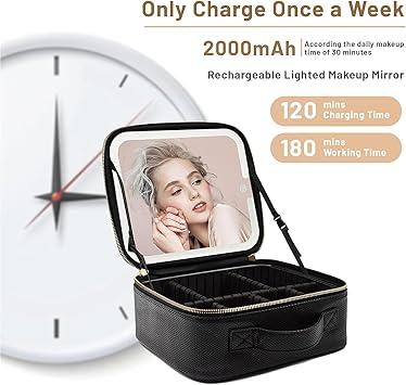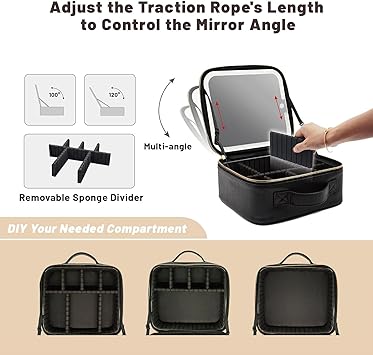 Portable Travel Cosmetic Bag with LED, 3-color Adjustable Organizer, Women's Case, Mirror Makeup Case Rechargeable (Pink)