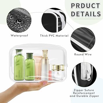 - 【Durable Material】- Made from thick, water-resistant PVC, these clear makeup bags are built to last. Easy to clean and reusable, they stand up to everyday wear and minor spills. (Note: zipper is not waterproof.)