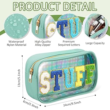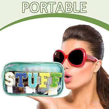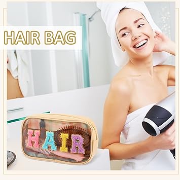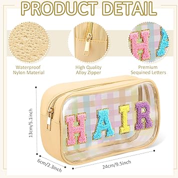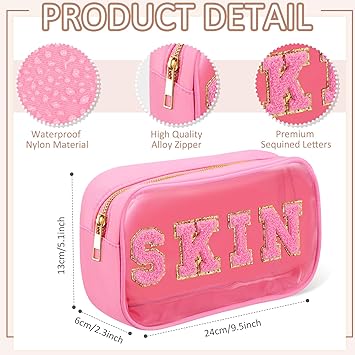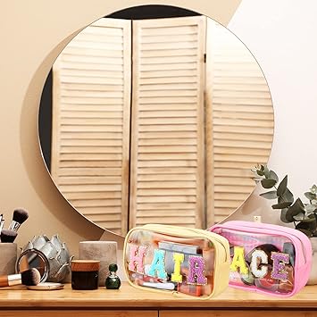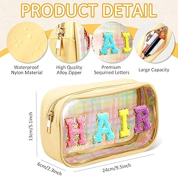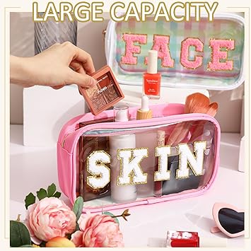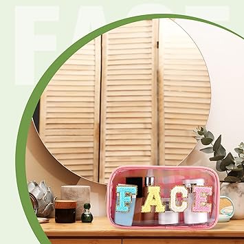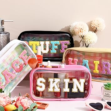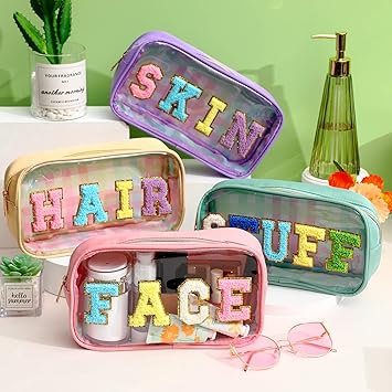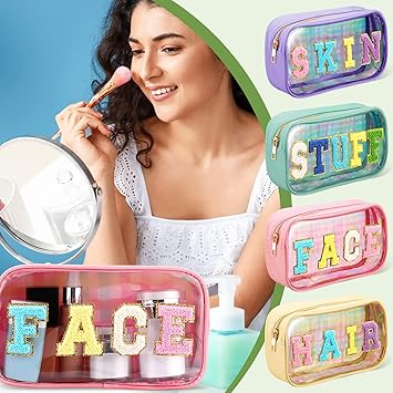 - Chenille Letter Cosmetic Bag: there are 4 pieces of letter cosmetic bags comes with 4 different designs, which firmly embroidered with the letter patches [SKIN], [HAIR], [FACE], [STUFF] and golden glitter border, stylish and novel appearance is favored among women
