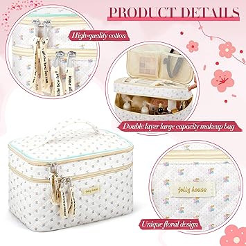 Zeyune 2 Pcs Cotton Quilted Makeup Bag for Women, Large Travel Coquette Cosmetic Bag, Aesthetic Cute Floral Toiletry Skincare Organizer(Double Layer Style)