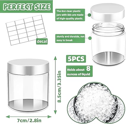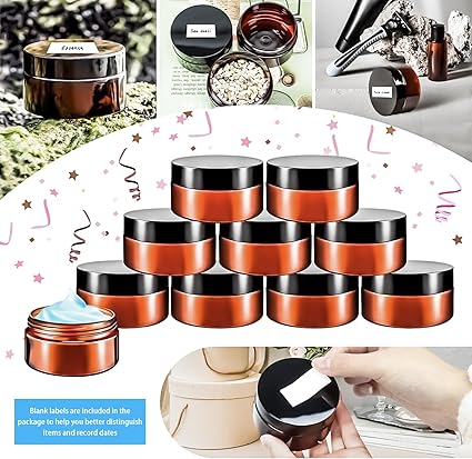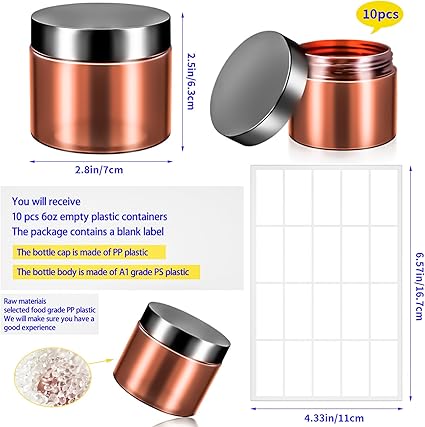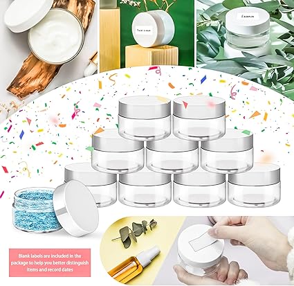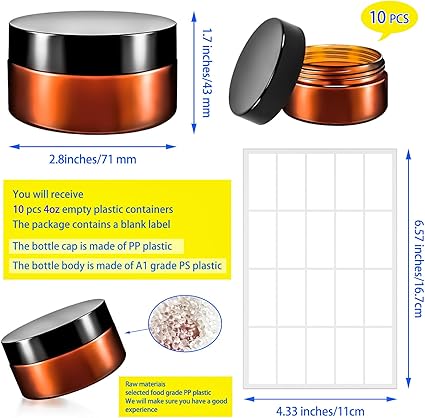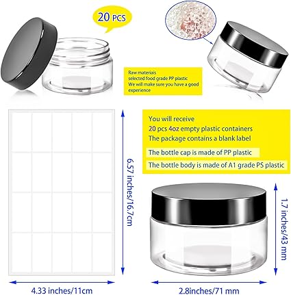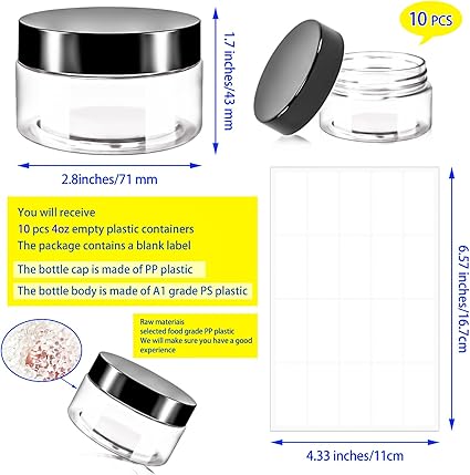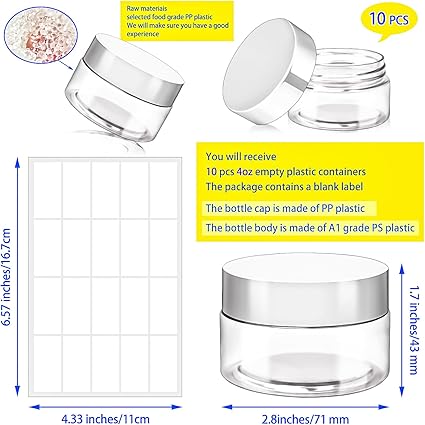 - Features: Refillable 4oz plastic cosmetic jars can effectively protect your lotions, creams and other cosmetics from the mess.The clear body of the jar allows you to better distinguish what items are stored inside,and blank labels are included in the package to help you better personalise,distinguish items and record dates,making it a good choice for our daily storage