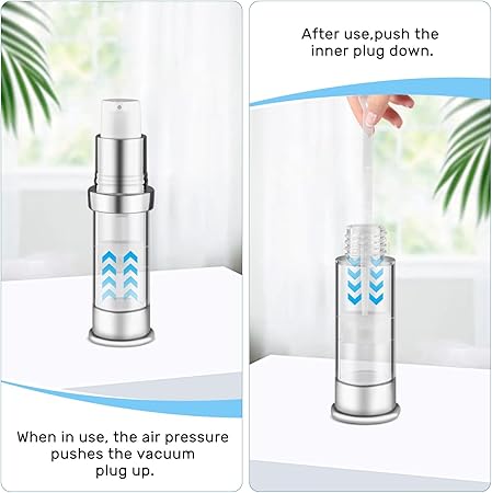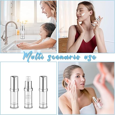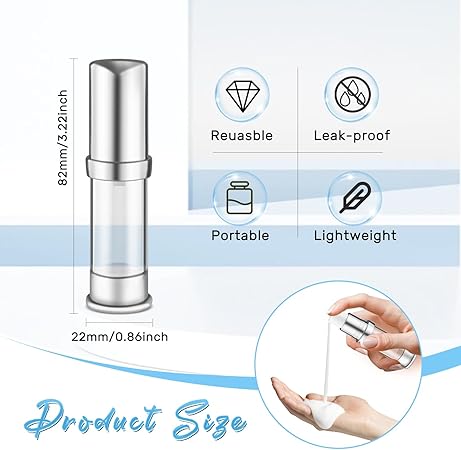 - Package Includes:12 pieces of airless lotion pump bottles,clear bottle body and silver lid,bottom diameter:19.8mm/0.78in,height:96mm/3.78in,capacity:10ml/0.35oz.