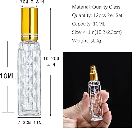 - Empty Refillable Bottle: 12 x 10ml glass fine mist spray bottle, 4 x funnels, 4 x droppers and 4 x perfume dispenser pump transfer tools. Easy to refill and no leakage!