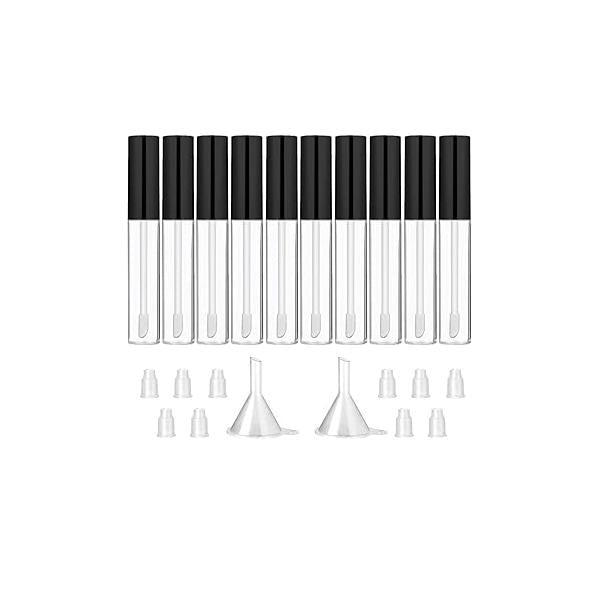 GTHER 10PCS 10ML Empty Lip Gloss Containers Tube with Wand, Refillable Balm Bottles, Lipstick Sample Container and Funnel Rubber Stoppers for Girls DIY Samples, Black Top