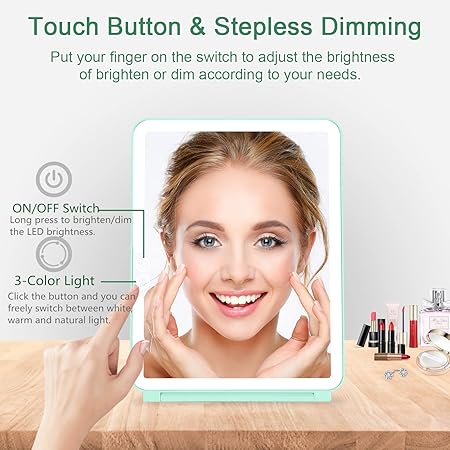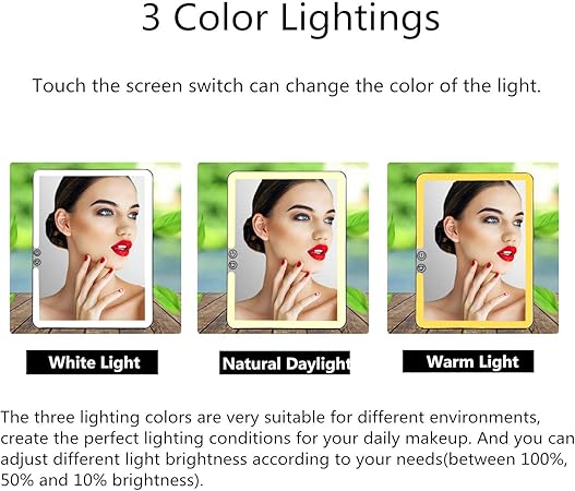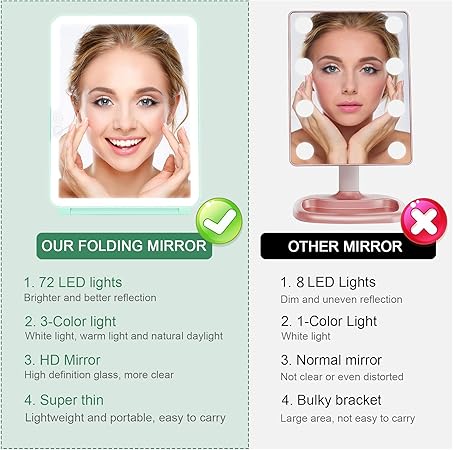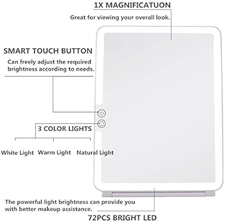 - 【 Powerful Light Brightness 】- This lighted makeup mirror surrounded by 72Pcs bright LED lights that can give you great assistance for making up and make you have perfect viewing while applying make up in dark or poorly lit areas. You can choose different light colors, white light, warm light and natural light according to your needs.