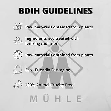 - BDIH CERTIFIED: All MÜHLE Organic products are BDIH certified, meaning they comply with strict guidelines from seed to sale. These qualifications include: No GMOs, synthetic fragrances, colors, petroleum derivatives, polymers, parabens, or other potentially harmful substances, and must utilize eco-friendly packaging.
